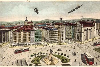 Je to docela známá pohlednice. Takhle nějak si neznámý autor před sto lety představoval Turnov v naší době. Tramvaje, výškové domy, náměstí sice stále do kopce, ale ze stávajících staveb lze zahlédnout jen kostel sv. Františka. Místo Prioru desetipatrová administrativní budova, místo spořitelny další novostavba. A to nejzajímavější je úplně vlevo. Při vjezdu do Jiráskovy ulice ohromné divadlo s římskými sloupy, že si člověk připadá jako ve Vatikánu.