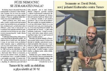 Vydání novin z poloviny září přináší dva stěžejní materiály. Je to představení nového jednatele Kulturního centra Turnov Davida Peška a významná aktualita z probíhajících jednání o fúzi nemocnic. To je ostatně asi nejdiskutovanější téma současného Turnova. Zejména po mediálním prohlášení ředitele liberecké nemocnice Luďka Nečesaného. V novinách je také informace o výsledku akce energií – ti občané Turnovska, kteří se do ní zapojili, by mohli ušetřit až 30 % nákladů. Ve vydání je také přehled obsazenosti škol na počátku školního roku – od mateřských po střední. Samozřejmostí je vyčerpávající přehled pozvánek na kulturní a sportovní akce v regionu a společenská kronika.