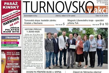 Ohlédnutí za oslavami 700 let Příšovic a Olešnice, pozvánka na 4. srpna, kdy bude slavnostně otevřen fotbalový stadion v Přepeřích, dostavba turnovského divadla, rekonstrukce školy v Mašově, magické datum 7. 7. přitahuje snoubence, turnovská stopa…