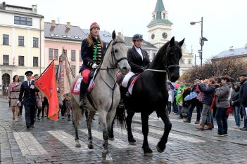 Hodina po poledni v neděli 28. října 2018 na turnovském náměstí. Déšť a podzimní sychravo. Průvod selské jízdy na koních,…