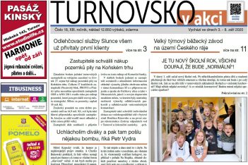 Je tu nový školní rok – snímky v novinách jsou z 1. září 2020 v turnovské ZŠ v Žižkově ulici, rozhovor TvA s hercem, dramatikem a spisovatelem Petrem Vydrou, pozvánka na předvolební debatu, spolek Slunce všem přivítal první klienty v odlehčovacích službách,…