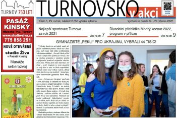 Pomáháme Ukrajině, hokejisté nakonec krajskou ligu nevyhráli, informační centrum je už zase na náměstí, hlasujte v anketě stavba roku. Co s turnovskými brownfieldy? Co víte i nevíte o Cryturu? 100 let SDH Kadeřavec, příloha Sportovec Turnova za rok 2021, kulturní pozvánky…