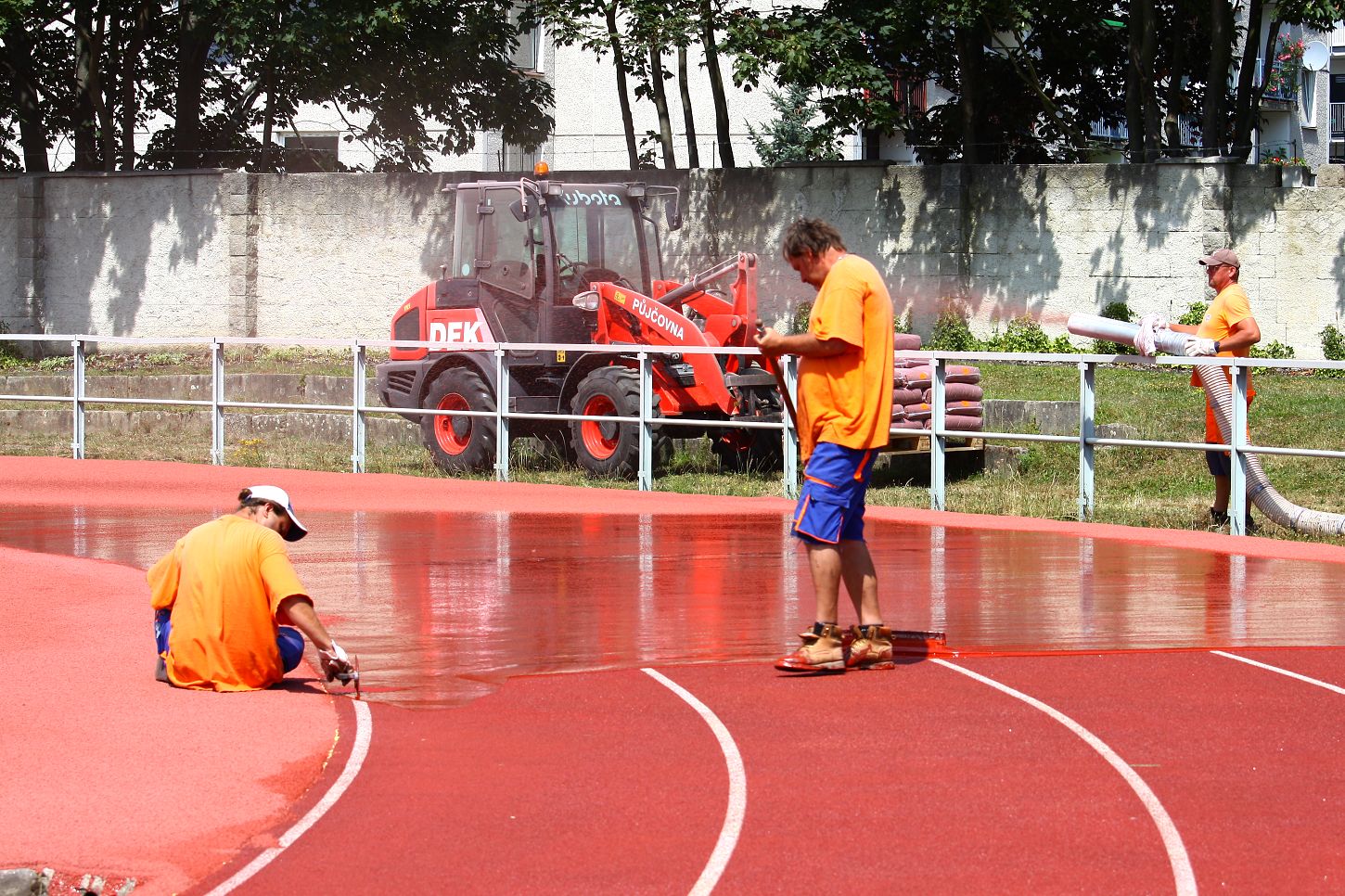 Finální pokládka proběhla od 22. do 26. července. Na nový povrch bylo použito zhruba 20 tun granulátu! Po rozměření drah geodetem je od 12. srpna v plánu lajnování povrchu, které bude trvat dva až tři dny podle počasí.