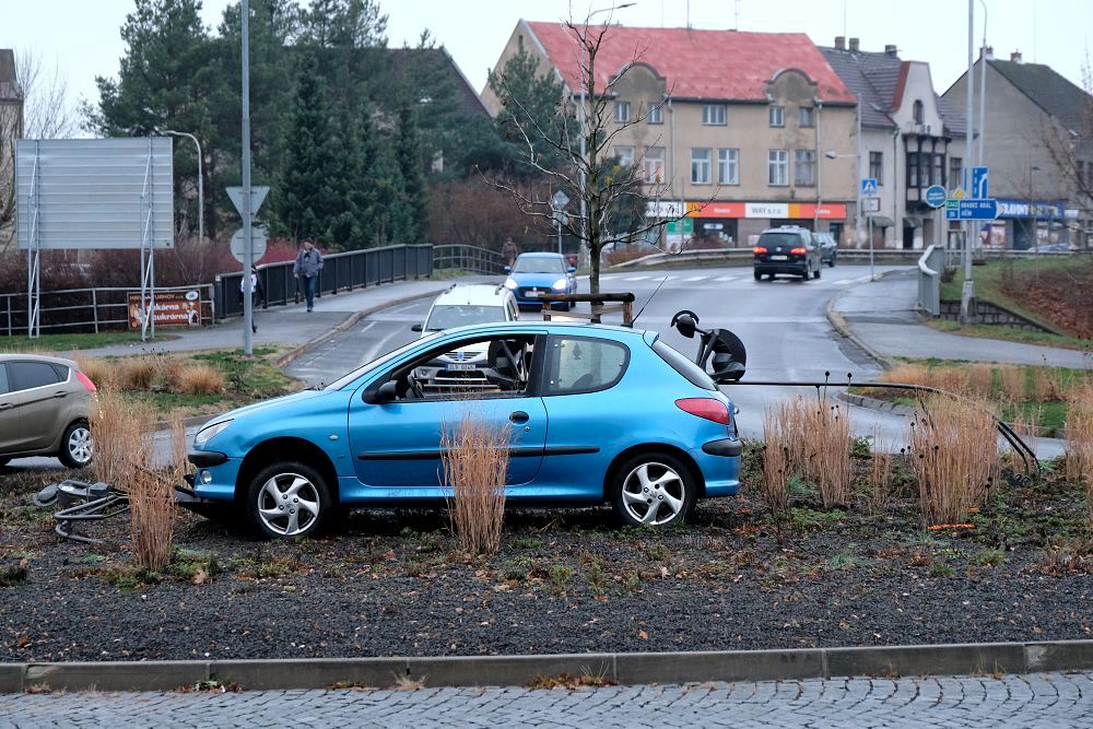 K poněkud kuriózní dopravní nehodě došlo dnes v 15.00 hodin na kruhovém objezdu v Bezručově ulici v Turnově. Podle mluvčí policie Ivany Balákové řidička s vozidlem Peugeot vjela do kruhové křižovatky z Palackého ulice a chtěla pokračovat do Bezručovy. Udělalo se jí ale nevolno a skončila uprostřed kruhového objezdu. „Ke zranění osob naštěstí nedošlo, škodu na vozidle dopravní policisté odhadli zhruba na deset tisíc korun, další otázkou bude škoda na uměleckém díle, které je na vnitřní ploše kruhového objezdu umístěno,“ uvedla tisková mluvčí.