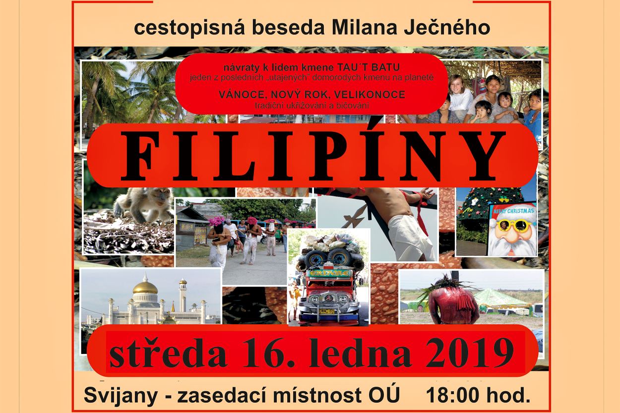 Ve středu 16. ledna můžete v prostorách obecního úřadu ve Svijanech navštívit unikátní besedu s turnovským cestovatelem Milanem Ječným. Podíváte se k jednomu z posledních „utajených“ domorodých kmenů na planetě, na Filipínách se stanete svědky tradičního ukřižování a bičování. „Na našich cestách nehledáme pohodlí, které nabízejí cestovní kanceláře, kdy zažijete předem daný počet slunečných dní v hotelovém komplexu za vysokou zdí a život místních lidí, či atmosféru země poznáte maximálně z několika předem naplánovaných výletů. Naše cesty jsou cesty s batohem na zádech a s nejistotou, zda i dnes najdeme střechu nad hlavou. Ale o to lépe se daná země poznává a navazuje se kontakt s místními lidmi,“ uvádí Milan Ječný. OÚ Svijany, 16. ledna od 18.00 hodin.