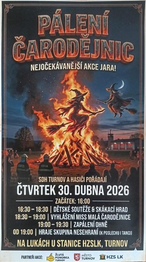 Ve čtvrtek 30. dubna v 16.00 hodin začíná v Turnově Na Lukách tradiční čarodějnický rej. V 16.30 odstartují dětské soutěže, naváže vyhlášení Miss Malá čarodějnice, od 19.00 hraje kapela Nesehraní, v 19.30 hodin bude zapálena vatra. Těšte se na atrakce pro děti i výborné občerstvení.