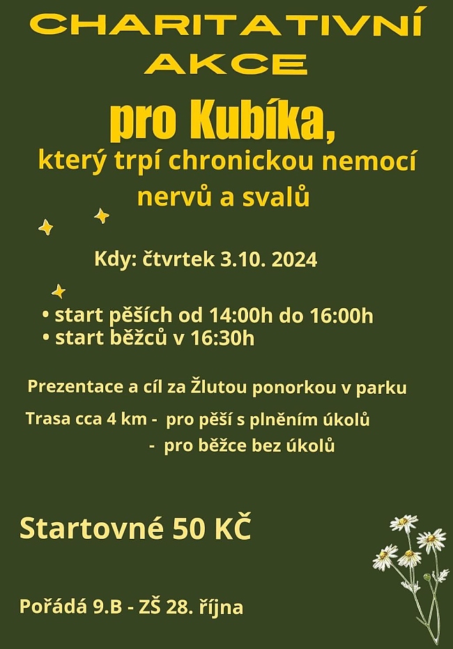 V rámci projektu Základní školy 28. října finančně pomoci Kubovi z Lestkova, který trpí chronickou nemocí nervů a svalů, se třída 9. B rozhodla uspořádat charitativní akci, jejíž výtěžek bude Kubovi věnován.