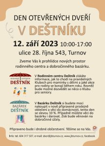 Den otevřených dveří proběhne v úterý 12. září od 10.00 do 17.00 hodin. Prostory rodinného centra a dobročinného bazárku najdete v turnovské ulici 28. října 543.