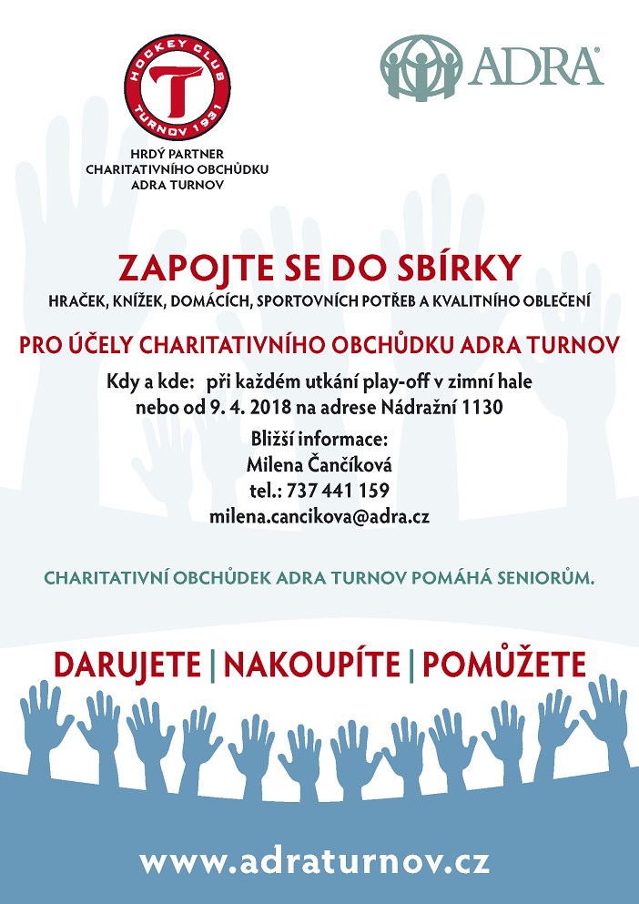 Při prvním utkání play-off nepodali hokejoví borci pouze krásný výkon na ledě, ale ukázali, že mají srdce na pravém místě. Před začátkem zápasu darovali organizaci ADRA šek v hodnotě 4.000 Kč. Ke sportovcům se přidali i fanoušci, kteří měli možnost přispět do zapečetěných pokladniček. Získané finanční dary se použijí na rozvoj dobrovolnictví u seniorů na Turnovsku. V průběhu dalších domácích zápasů mohou návštěvníci přinést také hračky, knížky, dárkové, sportovní potřeby nebo kvalitní oblečení. Tyto věci se následně formou veřejné sbírky prodají v nově vzniklém charitativním obchůdku ADRA v Nádražní ulici a peníze se věnují na dobrovolnické programy seniorů.