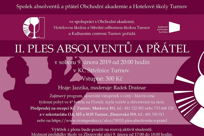 V sobotu 9. února se v Kulturním centru Střelnice uskuteční již druhý ročník výjimečného plesu, který ve spolupráci se školou pořádá Spolek absolventů a přátel Obchodní akademie a hotelové školy Turnov. Vstupenky na ples lze zakoupit v předprodeji na recepci Kulturního centra Turnov nebo na ředitelství školy. Moderátorem večera bude Radek Drašnar, k tanci bude hrát pro Turnov zatím neznámá kapela Jazzika (www.jazzika.cz). Těšit se můžete také na několik překvapení.