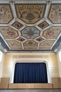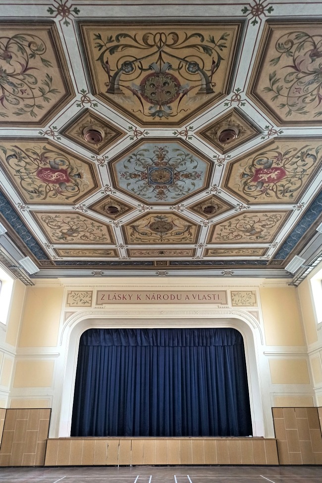 V létě 2020 jsme se pustili do velké akce, kterou byla rekonstrukce malovaného stropu ve velkém sále sokolovny. Kromě samotného stropu se restaurátorům podařilo obnovit nápis nad jevištěm a my jsme tak krásu naší sokolovny posunuli zase o kousek dál. Celý dojem ale rušila stará a nevyhovující opona. Protože se jedná o nákladnou záležitost, musel výbor jednoty schválit její