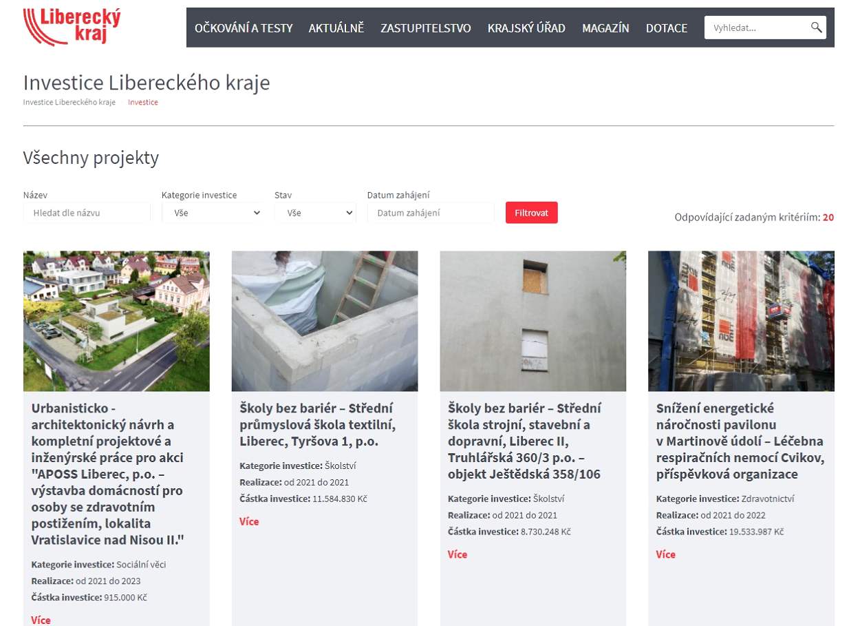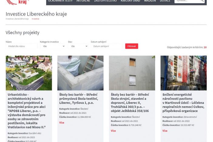 Mapa přináší přehled investic do pozemních staveb v hodnotě od 3 milionů korun bez DPH. Ty připravuje odbor investic a správy nemovitého majetku Krajského úřadu Libereckého kraje. Nyní čítá přehled dvaačtyřicet stavebních akcí napříč regionem. Uživatelé si při hledání mohou zvolit filtr podle resortů, stavu projektu, data zahájení či samotného názvu. (Zdroj: TZ LK)