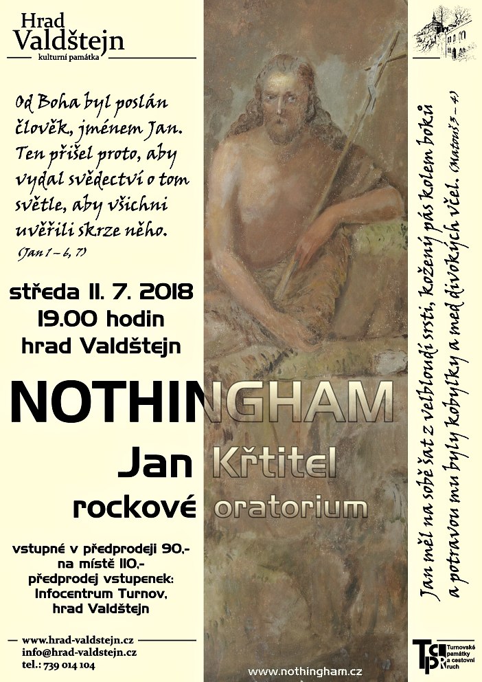 Ve středu 11. července od 19.00 hodin proběhne další repríza výjimečného hudebního díla rockového oratoria Jan Křtitel v podání kapely Nothingham. Koná se na hradě Valdštejně na prvním nádvoří před kapličkou sv. Jana Křtitele. „Protože se bude jednat o na delší dobu poslední reprízu, přizvali jsme další hosty – dvojici houslistů a tři pozounistky. Zážitek z hudby tak bude ještě víc umocněn,“ zve na koncert frontman kapely Pavel Mlejnek.
