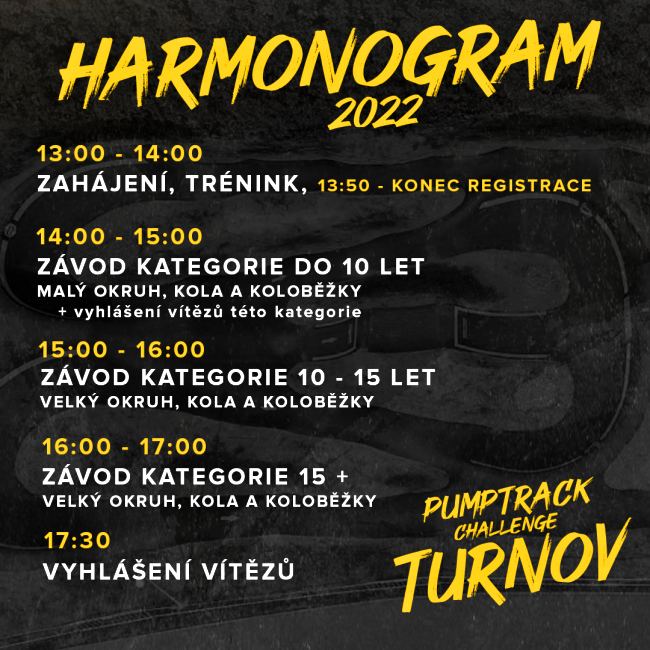 Závody se zde uskuteční v sobotu 20. srpna. Od 13.00 probíhá volný trénink, ve 13.50 končí registrace a ve 14.00 hodin na malém okruhu startuje závod pro děti do 10 let. Na něj od 15.00 hodin navážou závody pro starší děti a v 16.00 hodin je na programu start závodu pro věkovou kategorii 15+.