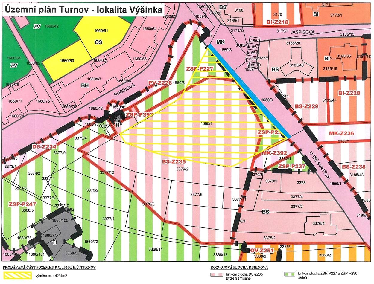 Město Turnov vyhlašuje záměr prodeje části pozemku parc. č. 1660/1 o výměře zhruba 4 234 m² v kat. území Turnov, evidované na LV č. 10001 u Katastrálního úřadu pro Liberecký kraj, Katastrální pracoviště Semily, a to za kupní cenu v minimální výši alespoň 1.350 Kč/m² prodávané části pozemku.