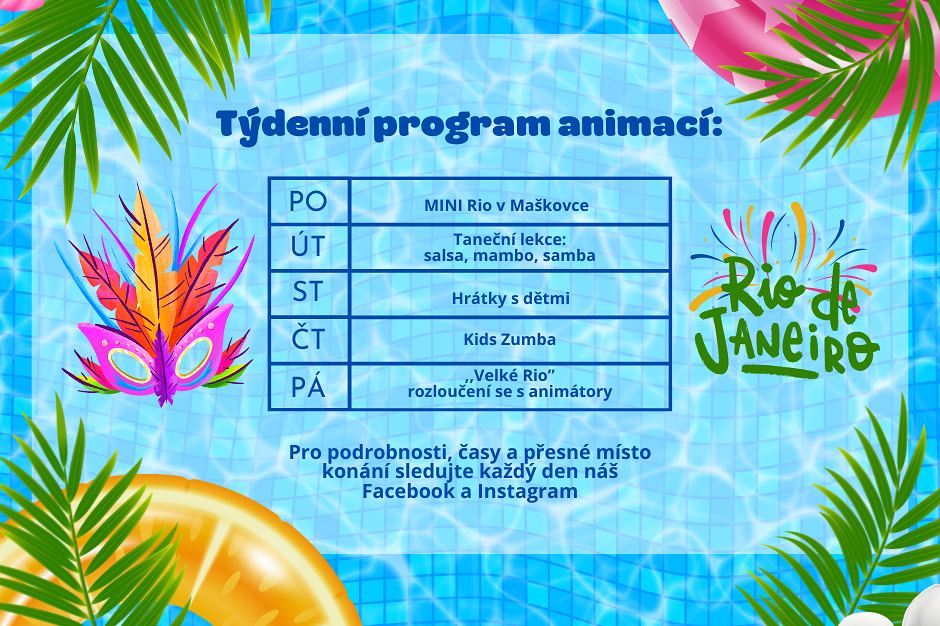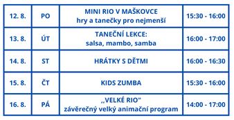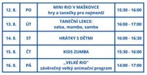 V pondělí od 15.30 hodin je na programu „Mini Rio v Maškovce“ pro nejmenší děti, v úterý od 16.00 hodin se můžete zúčastnit tanečních lekcí samby, salsy a mamby, ve středu odpoledne jsou na programu hrátky a dětmi, ve čtvrtek Kids zumba, v pátek od 14.00 hodin VELKÉ RIO – závěrečný animační program letošního léta pořádaný společností Ilma Agency.