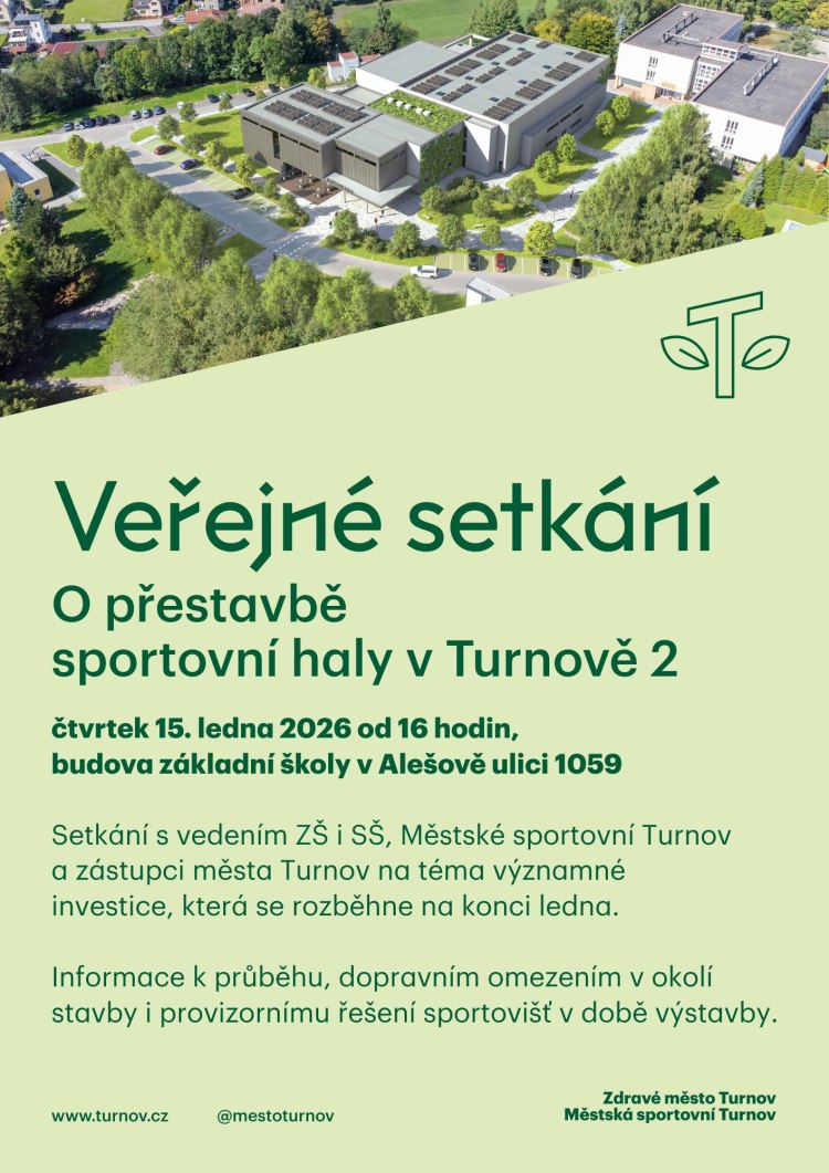Srdečně zveme na veřejné setkání o přestavbě sportovní haly v Turnově II, které se před samotným zahájením stavebních prací koná v budově základní školy v ulici Alešova čp. 1059 (vstup hlavním vchodem).