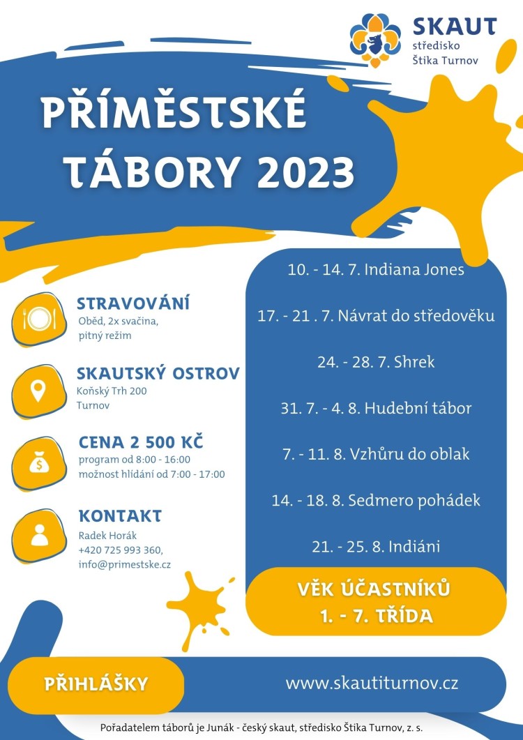 Letošní skautské příměstské tábory již znají své vedoucí a jejich organizační týmy. Vydejte se s námi napříč světem i proti proudu času až do dávného středověku, do říše pohádek nebo na divoký západ. Jako každý rok je navíc připravený i hudební tábor. Přihlašování je už spuštěno a volná místa pomalu mizí, tak dlouho neváhejte. Chcete-li se některého z běhů zúčastnit, navštivte naše webové stránky https://primestske.skautiturnov.cz, kde najdete veškeré informace i on-line přihlašovací formuláře. Tábory jsou pro děti od 1. do 7. třídy ZŠ a konají se na skautské základně Ostrov u Koňského trhu. Cena tábora zahrnuje pitný režim, dvě svačiny, oběd a aktivity dle programu.