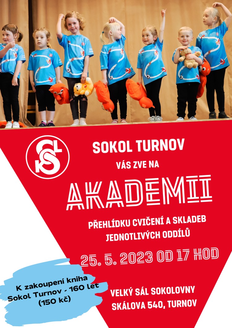 Ve čtvrtek 25. května od 17.00 hodin se ve velkém sále sokolovny uskuteční sportovní akademie – přehlídka cvičení a skladeb jednotlivých oddílů TJ Sokol Turnov. Kromě vystoupení uvidíte i nástup krojovaných sokolů a špičková vystoupení na trampolíně. Na místě bude k zakoupení kniha „Sokol Turnov – 160 let“.