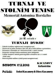 V sobotu 17. února je koná již 44. ročník Memoriálu Antonína Horského ve stolním tenise. Hrát mohou registrovaní i neregistrovaní, startovné za družstvo je 150 Kč, prezentace od 7.00 do 8.00 hodin. KD Kacanovy. Vítězné družstvo obdrží putovní pohár a družstva na 1. – 3. místě získají věcné ceny. Pořádá Sokol Kacanovy.