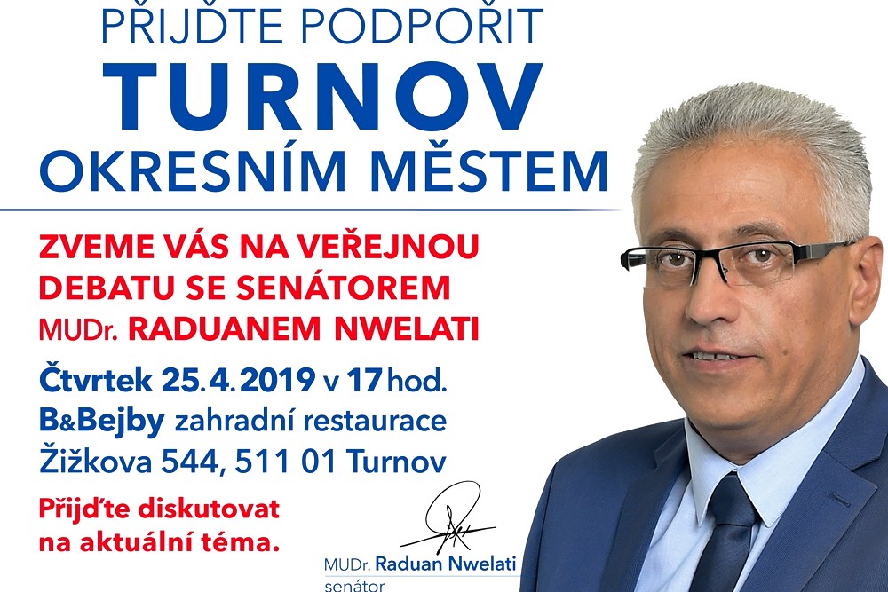 Zveme vás na veřejnou besedu se senátorem MUDr. Raduanem Nwelatim. Koná se ve čtvrtek 25. dubna od 17.00 hodin v BBejby v zahradní restauraci v Žižkově ulici. Přijďte se svým senátorem diskutovat na aktuální témata vašeho života.