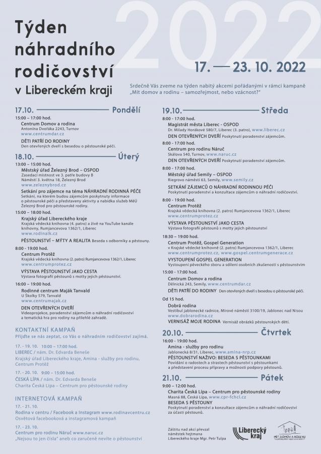 Týden náhradního rodičovství je pořádán v rámci celokrajské kampaně „Mít domov a rodinu – samozřejmost nebo vzácnost?“. Kampaň připravuje Krajský úřad Libereckého kraje a tzv. doprovázející organizace. Hlavním cílem kampaně i celého Týdne náhradního rodičovství je zvýšit informovanost široké veřejnosti o náhradním rodičovství (tj. pěstounství a osvojení/adopce), vyvrátit různé mýty a předsudky, které mezi lidmi o náhradním rodičovství panují a zvýšit počet žadatelů o vykonávání náhradní rodinné péče. V rámci letošního ročníku Týdne náhradního rodičovství jsou pro veřejnost připraveny volně přístupné besedy s odborníky i samotnými pěstouny, dny otevřených dveří, výstavy, koncert nebo také kontaktní a internetové kampaně.