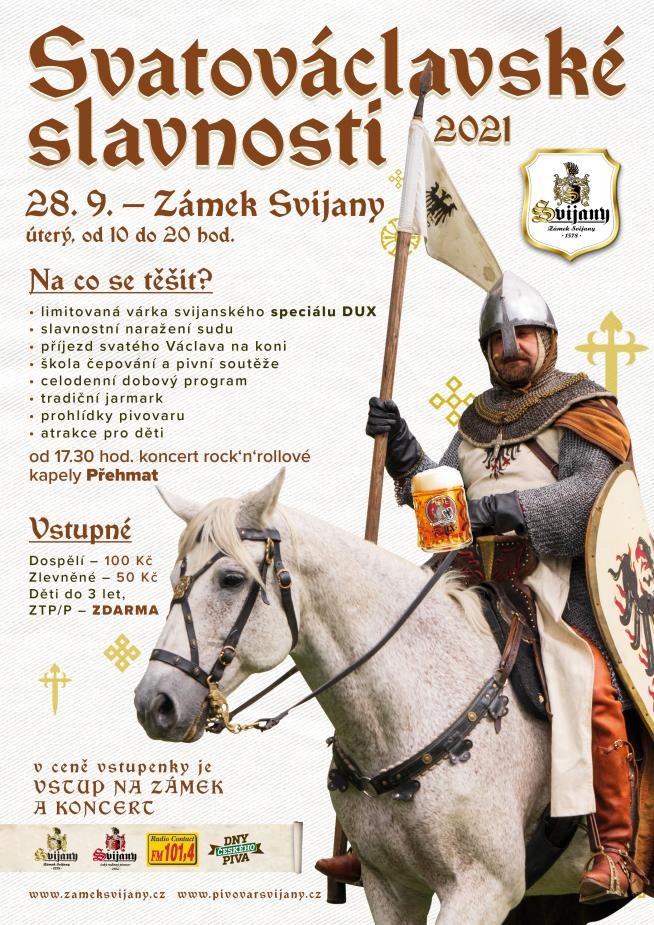 Svatý Václav, patron českých zemí i lahodného zlatavého moku, přijede na Zámek Svijany již popáté (ZDE). Po celý den na vás čeká bohatý dobový program, na nádvoří zámku vystoupí kejklíři, šermíři, těšit se můžete na přehlídku pivních šatů a mnoho dalšího. Akci zakončí koncert liberecké kapely Přehmat.