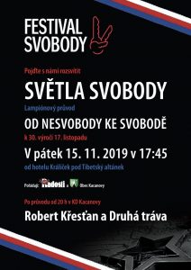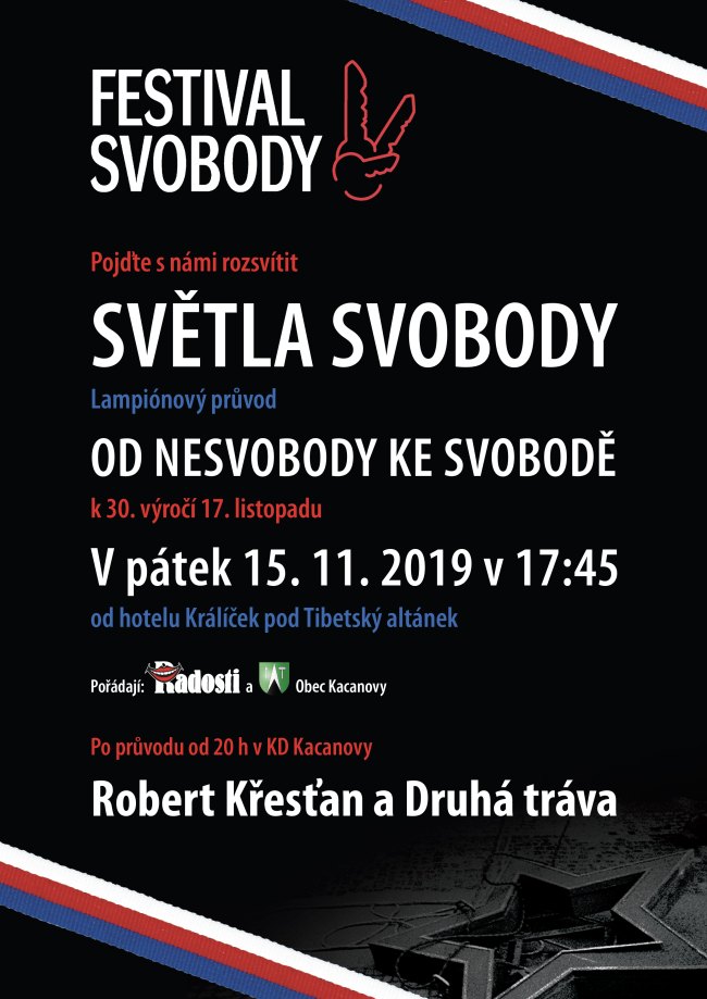 * SVĚTLA SVOBODY V KACANOVECH. Oslava 30. výročí Listopadu 1989 proběhne v Kacanovech formou jakéhosi „cestování časem“. Průvod účastníků se světly a lampiony projde nejprve obdobím totality a pak i obdobím posledních svobodných třiceti let (začátek v 17.45 hodin u Hotelu Králíček). Cestou si připomeneme klíčové události těchto období a na konci trasy, pod slavnostně osvětleným Tibetským altánkem, vyslechneme výzvu k obraně svobody a demokracie. Před KD Kacanovy pak zazní písně Karla Kryla a další zdravice. Akci pořádá spolek RADOSTI ve spolupráci s obcí Kacanovy.