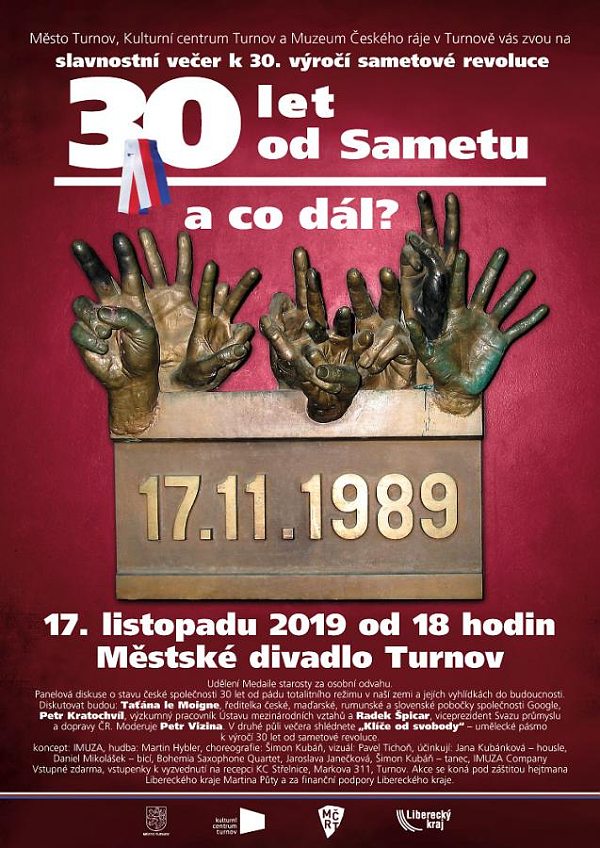 * 30 LET OD SAMETU – A CO DÁL? Město Turnov, Kulturní centrum Turnov a Muzeum Českého ráje v Turnově za finanční podpory Libereckého kraje a pod záštitou hejtmana Martina Půty vás srdečně zvou do městského divadla.