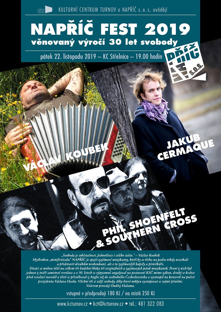 * NAPŘÍČ FEST 2019, věnovaný výročí 30 let svobody. Myšlenkou „minifestivalu“ NAPŘÍČ je spojit zajímavé muzikanty, kteří by se třeba na podiu nikdy nesetkali, představit (nejen turnovským) divákům neokoukané, ale o to zajímavější kapely a písničkáře, ale především přiblížit jim trochu jiné hudební žánry a originální interprety, než ty, které jim vnucuje každodenní mainstream.
