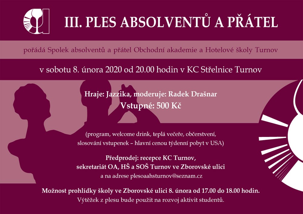 * PLES ABSOLVENTŮ A PŘÁTEL ŠKOLY OAHŠ TURNOV. K tanci a poslechu zahraje Jazzika. KC Střelnice od 20.00 hodin, vstupné 500 Kč.