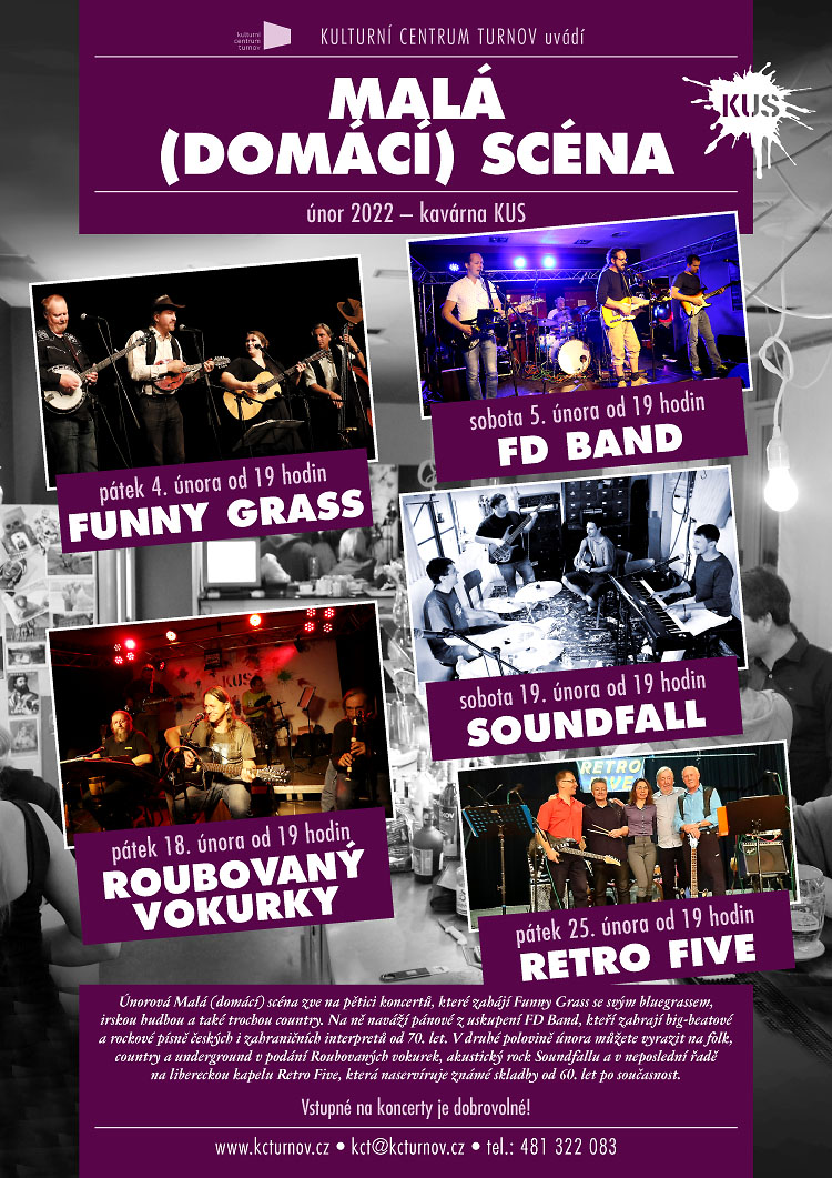 * FD BAND. Známá turnovská skupina zahraje písně Petra Kalandry, Oborohu, Vladimíra Mišíka nebo kapely Buty. A taky The Beatles, Erica Claptona, Lennyho Kravitze, Carlose Santany a dalších. Kapela vznikla v létě roku 2007 v podhoubí turnovské hudební scény. Malá (domácí) scéna, kulturní kavárna KUS od 19.00 hodin, vstupné dobrovolné.