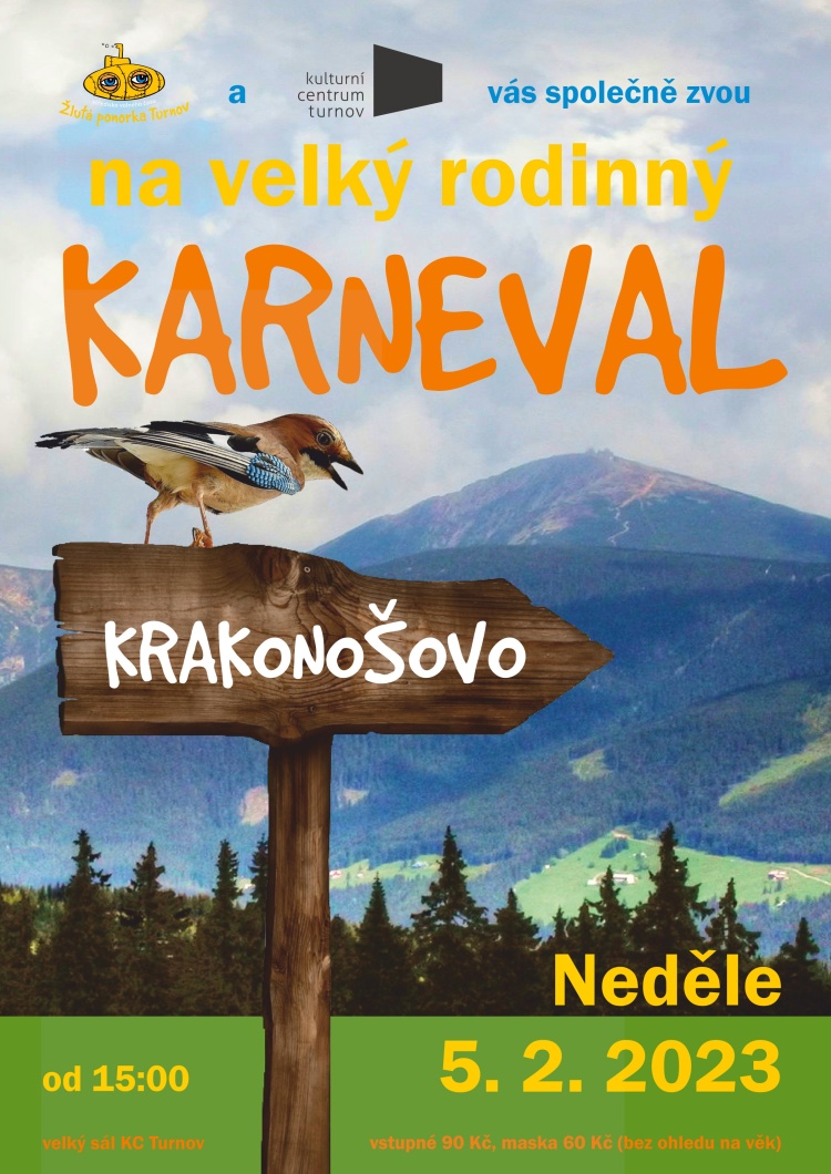 * VELKÝ RODINNÝ KARNEVAL. Žlutá ponorka ve spolupráci s Kulturním centrem Turnov vás zvou na tradiční karneval. Čekají vás hry, zábava a soutěže pro maličké i větší děti i pro rodiče. Karnevalový rej potrvá do 17.00 hodin. Střelnice od 15.00 hodin, vstupenky k dostání pouze na místě – 90 Kč bez masky, 60 Kč s maskou bez ohledu na věk.
