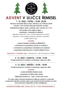 * ADVENT V ULIČCE ŘEMESEL. Nemusíte jezdit do Drážďan ani na Staré Město pražské, můžete si užít první adventní víkend ve svém městě s místními tvůrci a strávit tak příjemné dny ve vánoční atmosféře v klidu a v téměř domácím pohodlí. Z uličky si jistě odnesete plno krásných zážitků z milých setkání a třeba si i odškrtnete pár položek z „vánočního seznamu“.