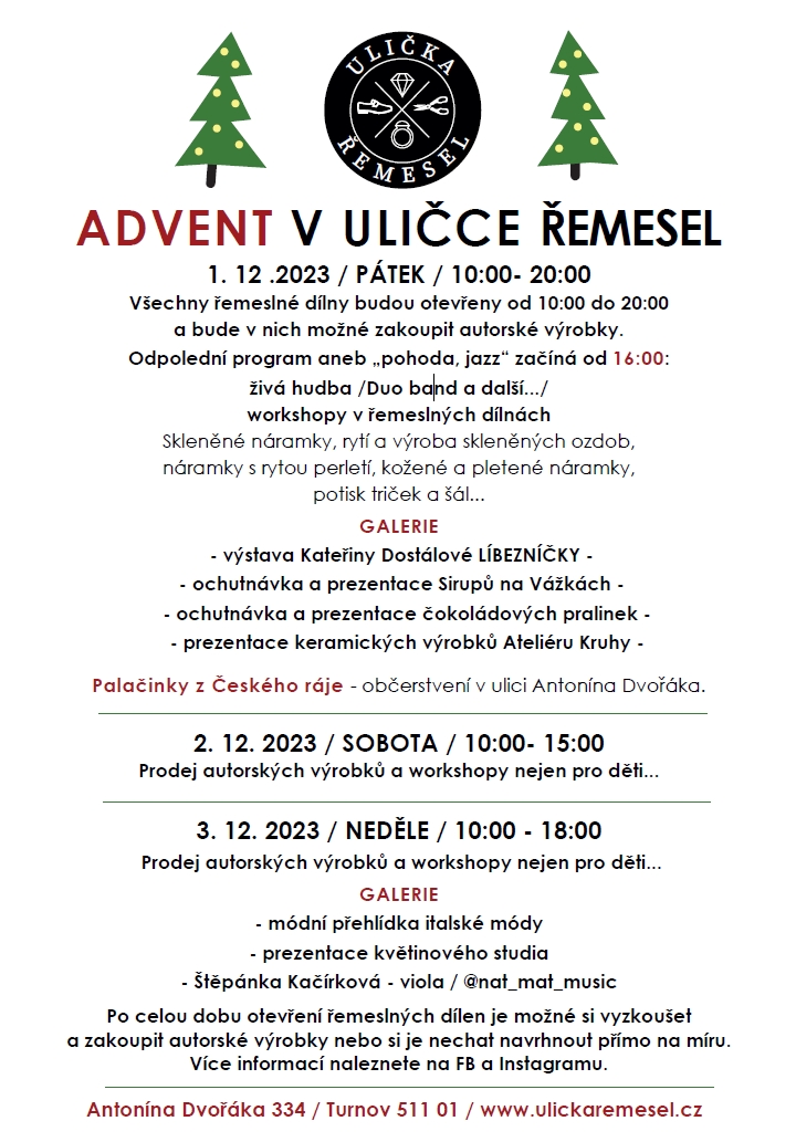 V pátek 1. prosince od 10.00 do 20.00 hodin budou otevřeny všechny řemeslné dílny, ve kterých si budete moci zakoupit autorské výrobky. Odpolední program aneb „pohoda, jazz“ začíná v 16.00 hodin: Duo BigBand, Jazz quartet ZUŠ Turnov, workshopy v řemeslných dílnách, skleněné náramky, rytí a výroba skleněných ozdob, náramky s rytou perletí, kožené a pletené náramky, potisk triček a šál, výroba šperků z drahých kovů a polodrahokamů… V galerii v patře výstava děl Kateřiny Dostálové „Líbezníčky“. Ochutnávka a prezentace sirupů a čokoládových pralinek, keramika z Ateliéru Kruhy. Palačinky z Českého ráje – občerstvení u vstupu do pasáže z nově zrekonstruované ulice Antonína Dvořáka.