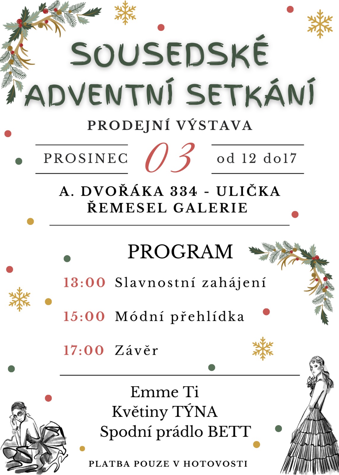 Neděle 3. prosince od 10.00 do 18.00 hodin: Prodej autorských výrobků a workshopy nejen pro děti… V galerii módní přehlídka italské módy (od 15.00 hodin) a prezentace květinového studia, živá hudba v podání Štěpánky Kačírkové – viola. Více informací najdete na FB a Instagramu. Ulička řemesel, Antonína Dvořáka 334, www.ulickaremesel.cz