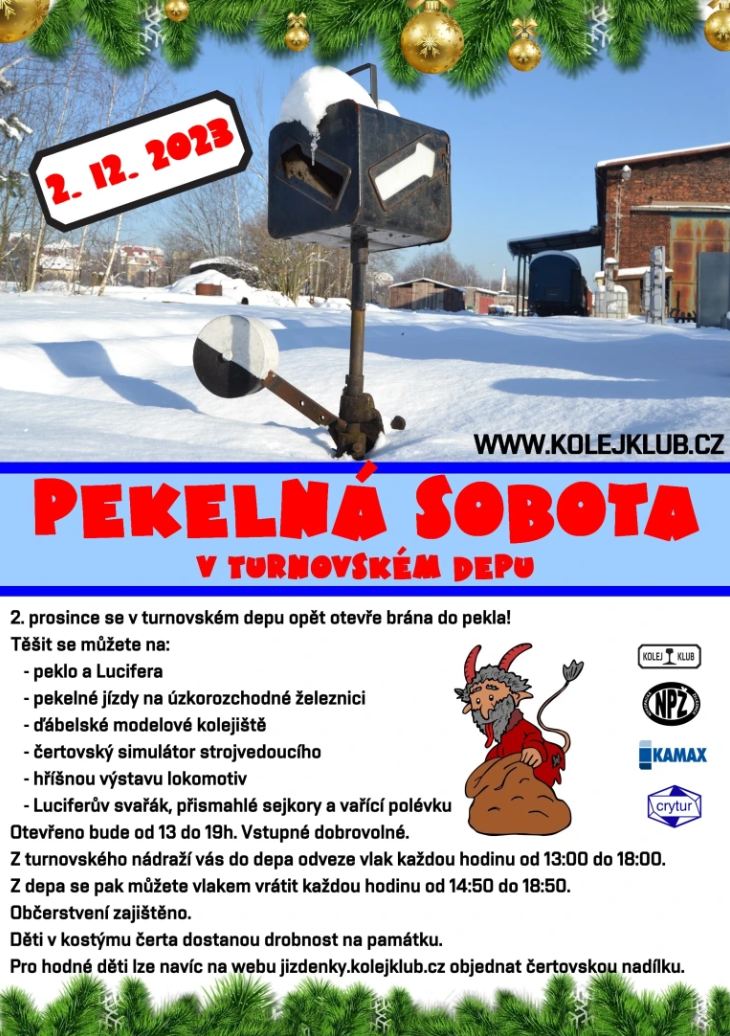 * PEKELNÁ SOBOTA V TURNOVSKÉM DEPU. Od 13.00 do 19.00 hodin se v turnovském lokomotivním depu otevře pekelná brána. Na návštěvníky čekají čerti, hříšná výstava lokomotiv, Luciferův svařák, pekelné jízdy na úzkorozchodné železnici a další aktivity. Každou hodinu jede z nádraží do depa motoráček Děti v kostýmu čerta dostanou drobnost na památku. Více na www.kolejklub.cz.
