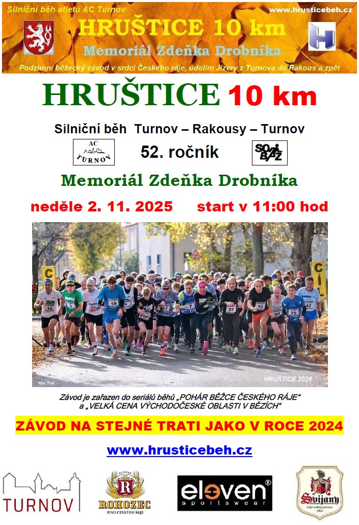 * SILNIČNÍ BĚH HRUŠTICE, 52. ročník. Trasa Turnov – Rakousy – Turnov. Letos podruhé na nové 10 km trati se startem a cílem v Metelkových sadech. Start v 11.00 hodin. Více na www.hrusticebeh.cz.