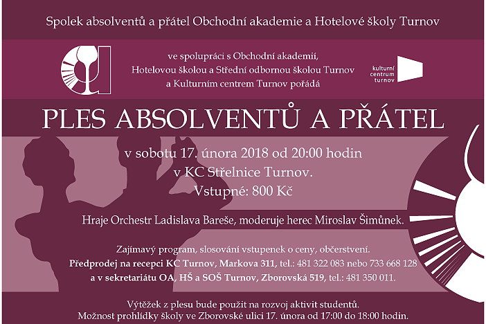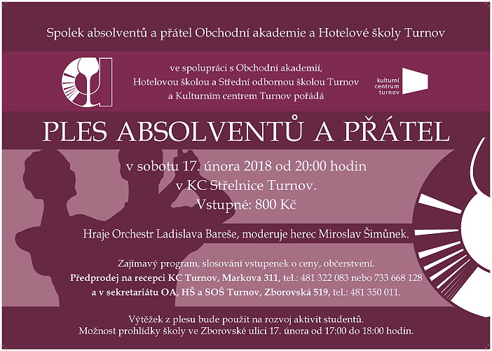 * PLES ABSOLVENTŮ A PŘÁTEL OAHŠ. Pořádá ve spolupráci se školou Spolek přátel Obchodní akademie a Hotelové školy. Sál Střelnice od 20.00 hodin. Hraje orchestr Ladislava Bareše, moderuje herec Miroslav Šimůnek. Zajímavý doprovodný program, slosování vstupenek o ceny, občerstvení. Vstupné 800 Kč, výtěžek z plesu bude použit na rozvoj aktivit studentů. Vstupenky v předprodeji v recepci KCT na Střelnici a v sekretariátu školy ve Zborovské ulici (tel. 481 350 011).