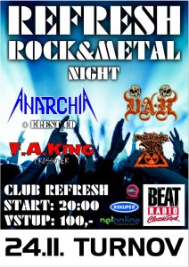 * METALOVÁ NOC V TURNOVĚ. Kvůli přestavbám v klubu Magic byli pořadatelé nuceni akci přesunout o pár bloků dál do klubu REFRESH. Při příležitosti akce bude kapela AnarchiA křtít své nové CD Oheň v duši!