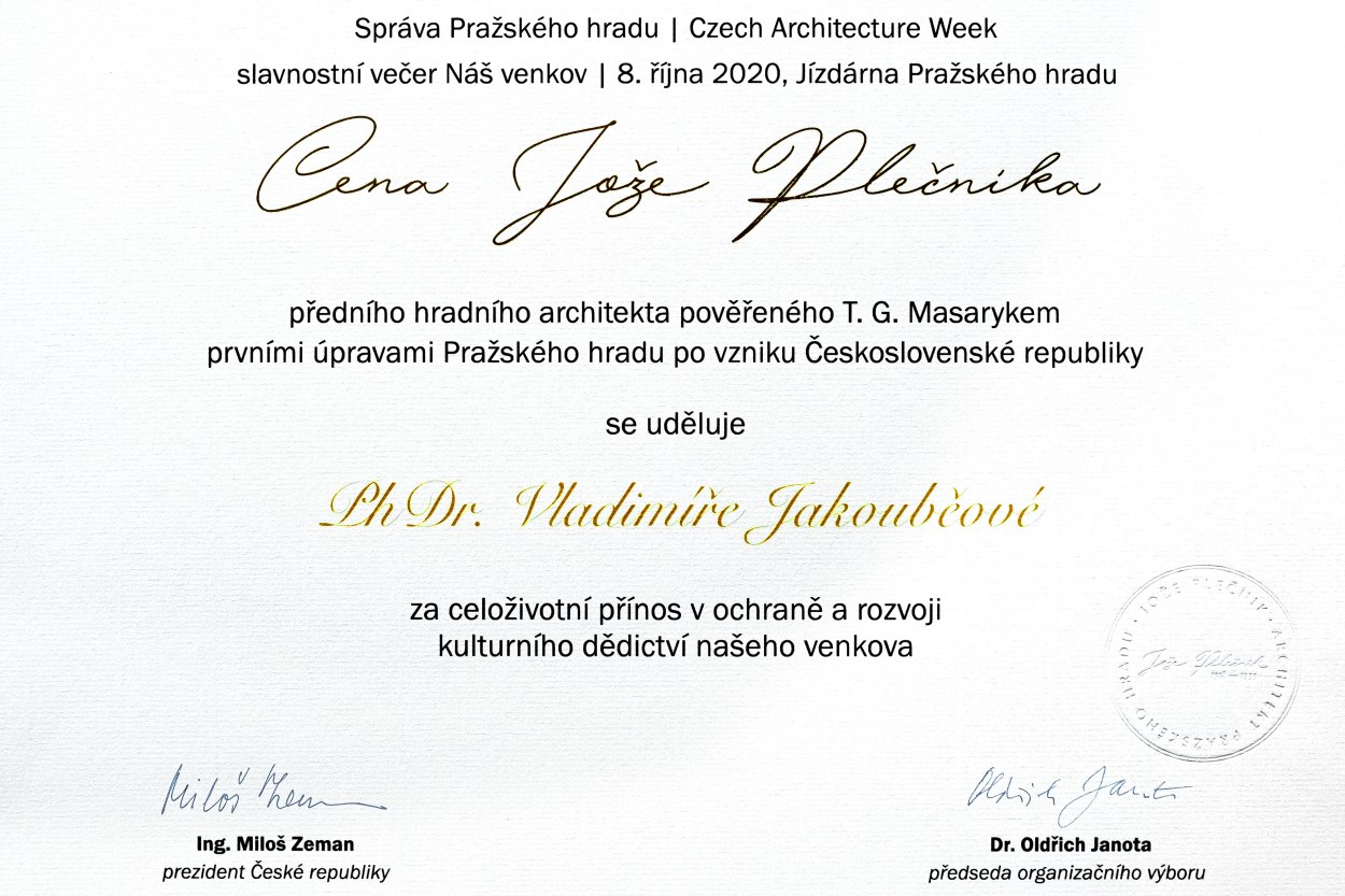 Ve středu 18. srpna bylo emeritní ředitelce turnovského muzea PhDr. Vladimíře Jakouběové na Pražském hradě předáno prestižní ocenění Cena Jože Plečnika 2020 za celoživotní přínos v ochraně a rozvíjení kulturního dědictví a lidových tradic. Vedle Vladimíry Jakouběové bylo oceněno dalších 15 osobností z celé České republiky. Na tuto cenu laureátku nominovali náměstkyně hejtmana Květa Vinklátová a hejtman Libereckého kraje Martin Půta.