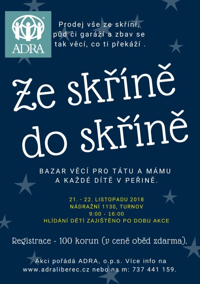 Dobrovolnické centrum ADRA v turnovské Nádražní ulici organizuje ve středu 21. a ve čtvrtek 22. listopadu bazar věcí „Ze skříně do skříně“. Zájemci z Turnova a okolí budou mít možnost sami prodat nebo nakoupit zimní oblečení, hračky, knížky, obuv, sportovní potřeby a mnoho dalšího. Každý prodávající bude mít za registrační poplatek 100 Kč oběd pro sebe a případně pro svůj dětský doprovod zdarma. Po celou dobu akce je maminkám nabídnuto také hlídání dětí. Bazar se bude konat od 9.00 do 16.00 hodin. V případě zájmu je vhodné si v Charitativním obchůdku ADRA zarezervovat prodejní místo.