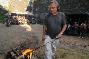 Kastelán na Troskách Lubomír Martinek zapaluje symbolický oheň 1. ročníku trampského festivalu Trosecký širák, který se na hradě uskutečnil v…