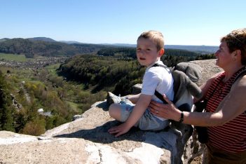 Pohled z věže přes zámecké střechy k Dračím skalám (foto: pch)