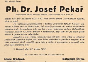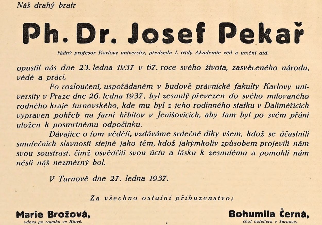 Rozloučení s profesorem Josefem Pekařem byla dokonce záležitost dvoudenní. Přední osobnosti našeho vědeckého, kulturního i politického života se mu naposledy poklonily nejprve v Praze 26. ledna 1937 před filozofickou fakultou na Smetanově náměstí – kam dorazil pohřební průvod z budovy právnické fakulty – a odtud pak nastoupil Josef Pekař svou poslední cestu do rodného Českého ráje.