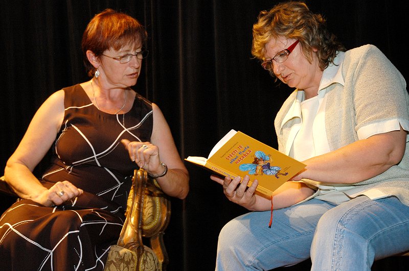 Štěstí je pěkně tlustá masařka. To je název nové knížky turnovské spisovatelky Dagmar Landrové. Ilustrace pořídila známá výtvarnice Víťa Klimtová, slavnostní křest se konal v turnovském divadle ve středu 13. června, s autorským čtením paní Dáše pomáhala Eva Kordová (obě na snímku), byla tu i paní Klimtová a písničkář Pavel Půta.