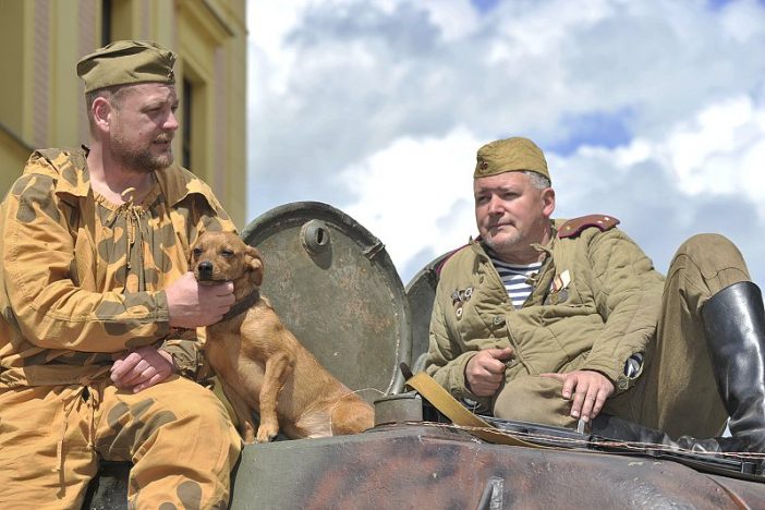 OSLAVY DNE VÍTĚZSTVÍ Odpočívající rudoarmějci před turnovskou sokolovnou na tanku T-34. Asi by šla podobná fotografie pořídit před 70 lety. Je však z dnešních oslav výročí konce války. Na snímku jsou členové Sdružení přátel vojenské historie SEVER 2013. Oslavy Dne vítězství byly soustředěny v Turnově ve čtvrtek 7. května do Skálovy ulice a jejího okolí. Byla zde k vidění historická i soudobá vojenská technika, konalo se oficiální uctění obětí nejničivější války v dějinách, odpoledne byl v parku připraven kulturní program. Více přineseme v samostatném článku.