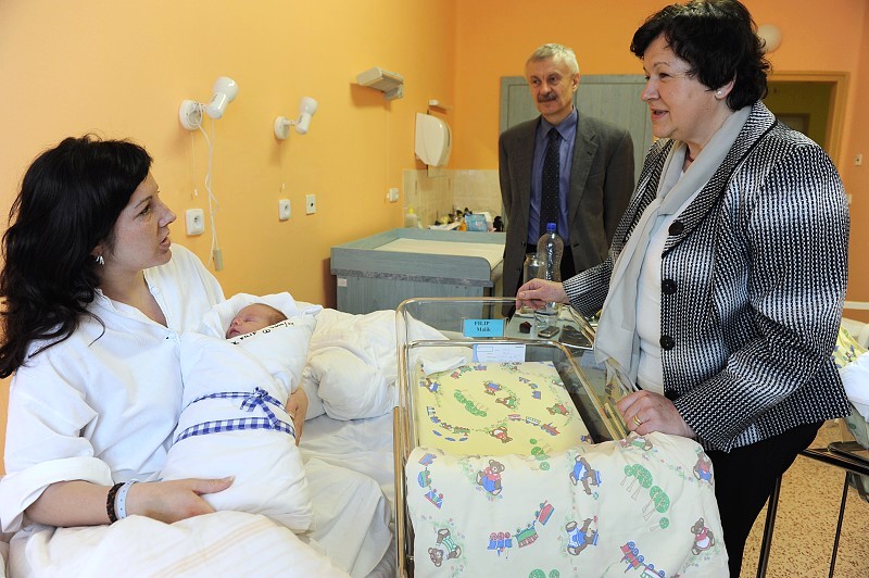 První turnovské miminko roku 2011 se v porodnici Panochovy nemocnice narodilo 1. ledna 2011 ve 22.27 hodin. Je jím Filip Malík (3,30 kg, 51 cm). On i maminka Markéta, pro kterou je to první dítě, se už těší domů do Jiráskovy ulice. Oběma v pondělí 3. ledna přišli popřát hodně štěstí a zdraví starostka města Hana Maierová spolu s místostarostou Otakarem Špetlíkem (na snímku). Filípek dostal zlatý přívěšek s měsíčním znamením a drobné dárky, maminka krásnou kytici… Podle primáře gynekologického oddělení Aleše Mikla bylo v roce 2010 ve zdejší porodnici 436 porodů, narodilo se 441 dětí, tedy v pěti případech dvojčata. V roce 2009 porodnice vykázala 478 porodů, v roce 2008 jich bylo 498. Nastává tedy pokles porodnosti dle předpovězené demografické křivky…