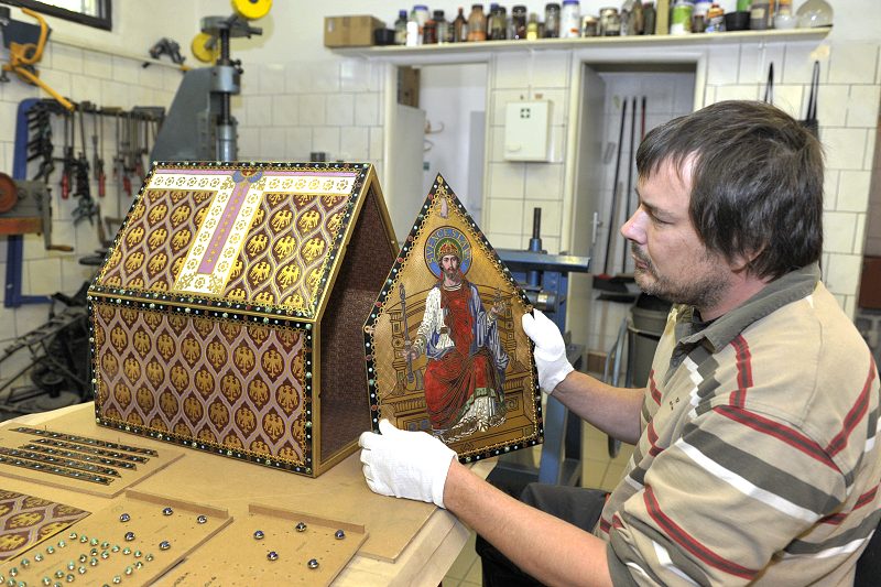 V MAŠOVĚ SI BLÍZKA SÁHLI NA HISTORII ČESKÉ ZEMĚ Martin Zdeněk z firmy Monstranz v Mašově připevňuje restaurovanou čelní desku na schránku na ostatky sv. Václava, která je umístěna v pražském chrámu sv. Víta. V Mašově v minulých dnech restaurovali celkem šest tzv. domečkových relikviářů na ostatky patronů naší země: sv. Václava, sv. Vojtěcha, sv. Víta, sv. Prokopa, sv. Cyrila a sv. Ludmily. Jednalo se o mimořádnou a prestižní zakázku, schrány v restaurované podobě už jsou opět na čelném místě hlavního oltáře nejdůležitějšího českého chrámu. „Byli jsme i přítomni na pražském arcibiskupství při vyjmutí ostatků ze schrán, to na senzitivního člověka hodně zapůsobí,“ přiznává majitel specializované firmy Milan Zdeněk. Více přineseme v samostatném článku.