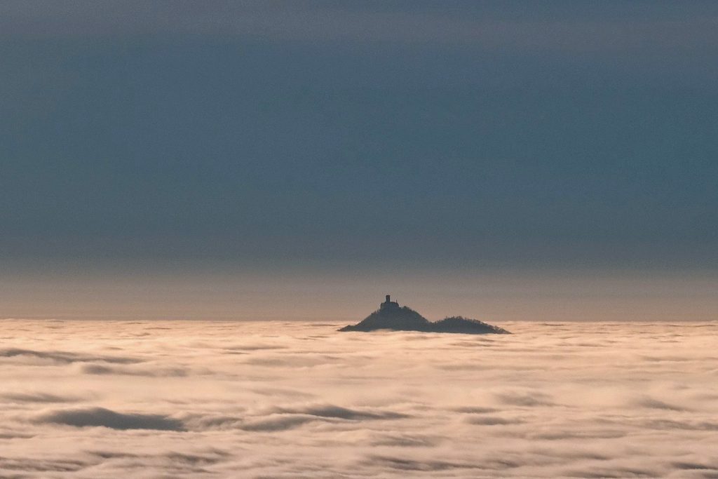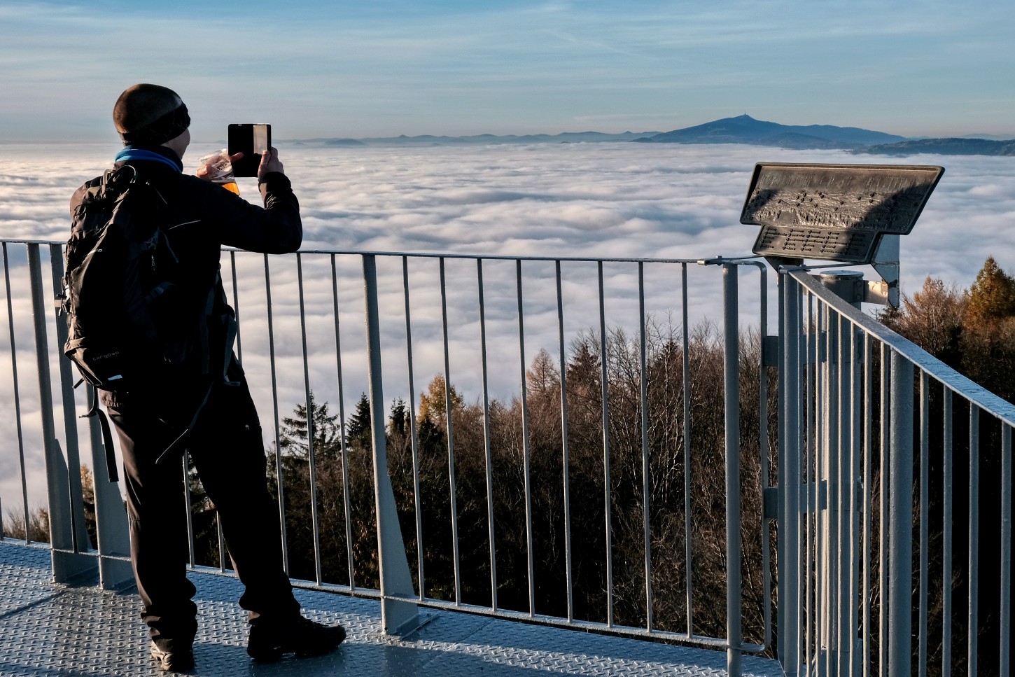 Na Kozákov zamířily v sobotu desítky lidí. Na zdejší rozhlednu zavítalo přes den zhruba 250 návštěvníků. Výhled byl impozantní – směrem ku Praze sluníčkem osvětlená mračna, ze kterých jako hrad na břehu moře vystupují Bezděz a Ralsko. Ještěd je přece jen více nad mraky. Na druhé straně se vám naskytne krásný pohled na panorama Krkonoš a Jizerských hor. Hřebeny jsou stále ještě bez sněhové pokrývky. (Rozhledna na Kozákově je do